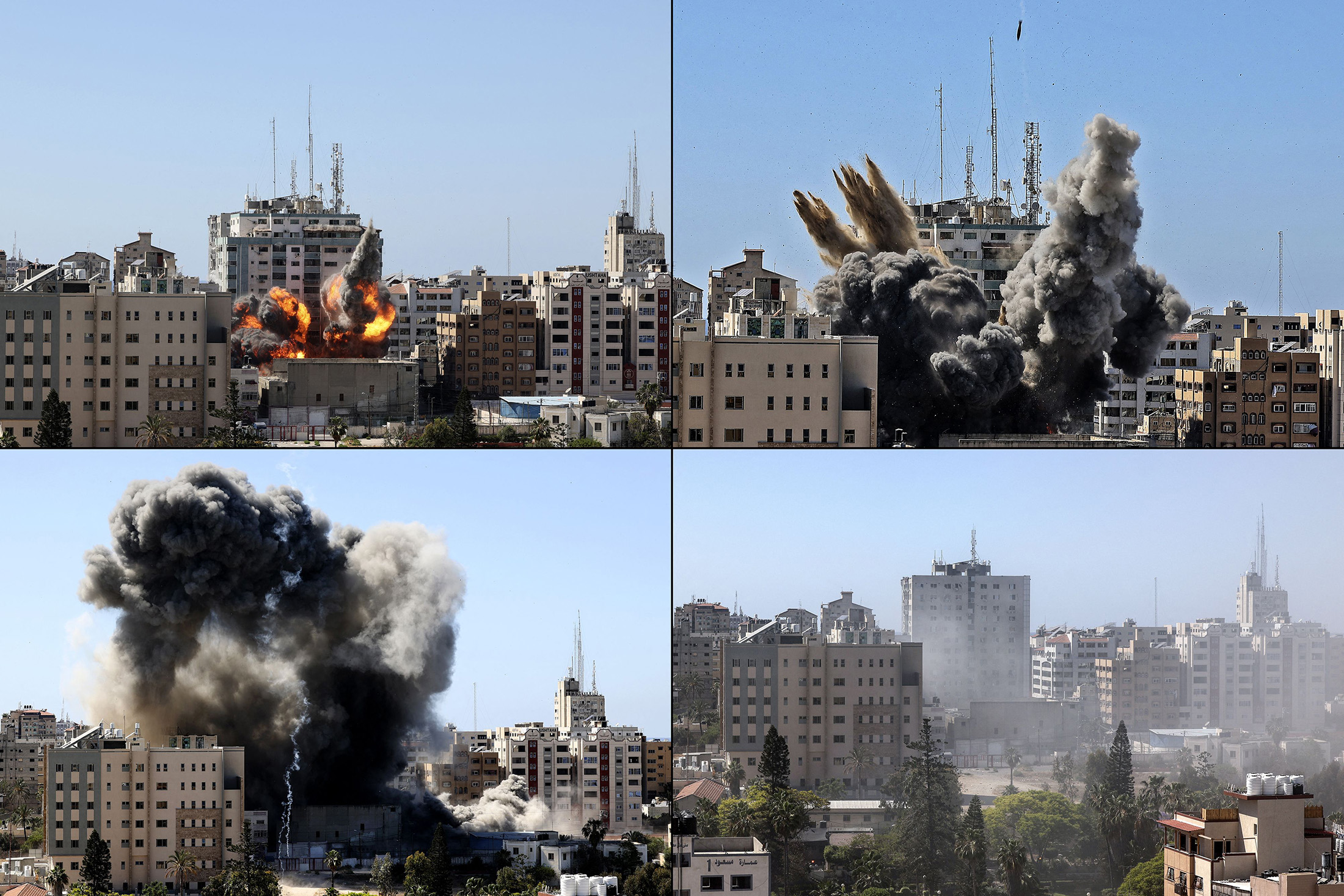 加拉塔(The Jala Tower),为加沙地区为全球记者提供住宿的地方,被以色列军方空袭,于5月15日,并轰然倒塌。以色列称,他们已经证实哈马斯在塔内进行许多(后方)操作,现在只是让这件事情公之于众。 照片由记者Mahmud Hams提供。