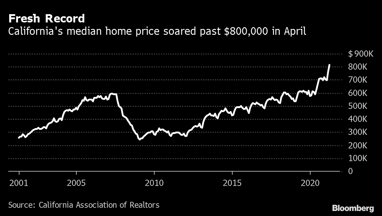 The pandemic is also burnishing California’s reputation for costly housing. Home prices in the state shot past $800,000 for the first time in April. The new median value of $813,980 is up 34% from a year earlier, when lockdowns mostly froze the housing market.