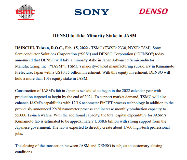 ShoelessCai 加注:索尼官网宣称,Denso(亦称“电装”)斥资3.5亿美元入股日本尖端半导体制造公司(JASM),JASM以台积电为大股东,此次购买,Denso将拥有JASM 10%股份。索尼官宣,2024年之前,对JASM的产量要求,达到12寸晶圆55000片每个月,制造高端制造型岗位1700多个。