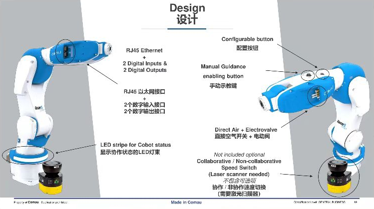 此次介绍的Razor-5 协作机器人,兼顾协作与速度,人类员工在安全区内时,机器人主打协作,以安全为主,最高速度500毫米/秒;人类员工在安全区外,机器人变身工业机器人,以工业作业速度为首要任务。该产品的设计,含有4个不同的接口。