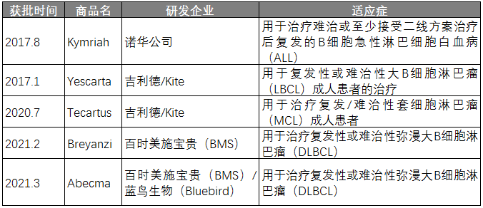 细胞免疫治疗疗法包括CAR-T细胞治疗(嵌合抗原受体T细胞治疗)、CIK细胞治疗、DC-CIK细胞治疗、DC细胞治疗、NKT细胞治疗、ACTL细胞治疗等。其中,CAR-T是免疫细胞疗法中最有希望的一种。目前,全球已有5款CAR-T细胞疗法获FDA批准上市。最先获批的两款产品已经在欧洲、日本、加南大等多个国家获批/申请上市。