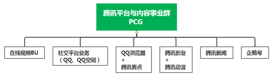2021年4月,腾讯迎来近两年最大组织变革。腾讯平台与内容事业群(PCG)发文,将整合腾讯视频、微视、应用宝业务,组建“在线视频BU”。此番调整后,腾讯将长短视频、音乐、社交、资讯等各大面向用户端内容板块聚集在一块。组织架构调整之后,腾讯公司内部有6个事业部,即企业发展事业群、云与智慧产业事业群、互动娱乐事业群、平台与内容事业群、技术工程事业群、微信事业群(腾讯咨询)。
