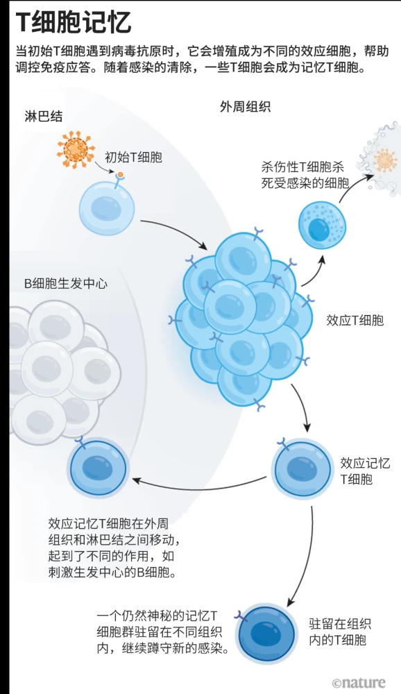 其次,看看 T细胞的角色。感染冠状病毒(比如引起普通感冒的感染)留下的T细胞也能识别新冠病毒。这些细胞或能对抗新冠感染,甚至能完全阻断感染。