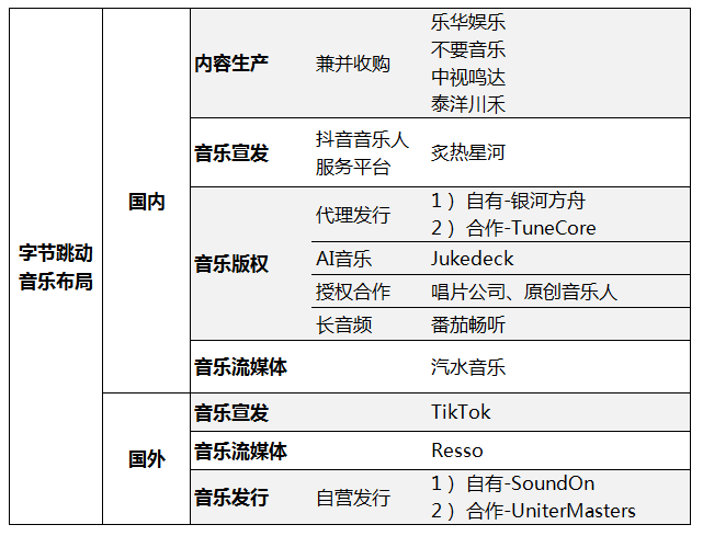 字节跳动通过投资和自身业务升级来形成一条从内容生产、音乐宣发到版权代理发行、流媒体的全产业链。通过投资乐华娱乐、不要音乐等内容公司,夯实供给端。另外,短视频平台TikTok、海外音乐流媒体服务Resso、发行平台SoundOn到本土市场的抖音、汽水音乐,全面展现了字节跳动在国内、国外的布局战线,为后续发展积蓄着能量。