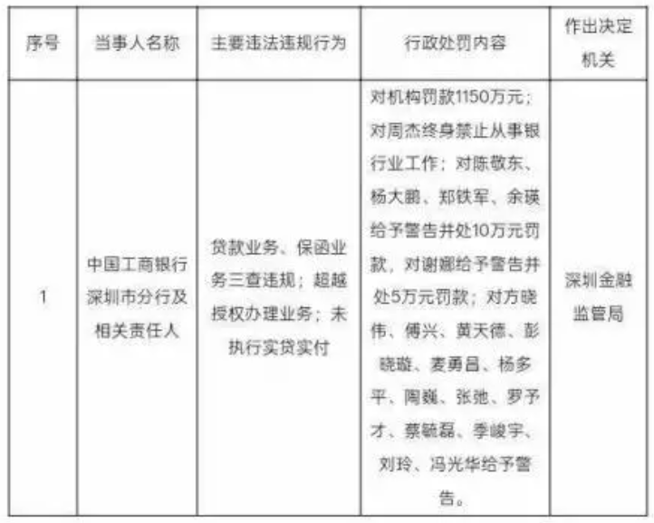 深圳金融监管局行政处罚信息公示显示,主要违法违规行为涉及,贷款业务、保函业务三查违规;超越 授信办理业务;未执行实贷实付。行政处罚内容,对机构罚款 1150 万元。对周杰终身禁止从事银行业工作;对陈敬东、杨大鹏、郑铁军、余瑛给予警告并处 10 万元罚款,对谢娜给予警告并处 5 万元罚款;对方晓伟、傅兴、黄天德、彭晓璇、麦勇昌、杨多平、陶巍、张弛、罗予才、蔡毓磊、季峻宇、刘玲、冯光华给予警告。
