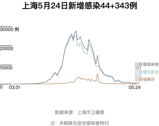 据上海市卫健委5月25日晨通报,2022年5月24日0—24时,新增本土新冠肺炎确诊病例44例和无症状感染者343例,其中32例确诊病例为既往无症状感染者转归,12例确诊病例和342例无症状感染者在隔离管控中发现。
