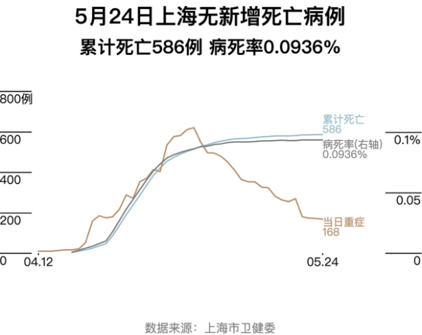 【财新网】5月24日上海新增新冠感染者较前一日下降20%,剔除无症状感染者转归后,新增感染355例,为3月18日以来新低;4月17日至5月18日以及5月20日至23日连续出现死亡病例,本轮疫情合计死亡已有586例;重症病例较前一日减少4例,为168例。