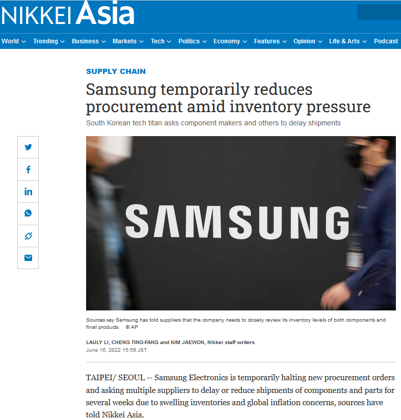 据日经亚洲评论16日报道,三星电子已经要求所有事业群暂停采购,通知一些供应商推迟或削减零部件发货至7月底,主要包含面板显示器、存储芯片、PCB、电源等,原因是需要盘点内部库存。