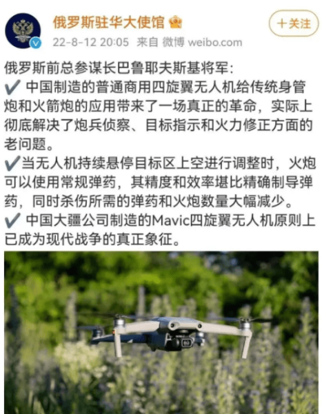 8月12日,俄罗斯驻华大使馆官方微博再次发文强调,称中国普通商用无人机给传统身管炮和火箭炮的应用带来了一场真正的革命。