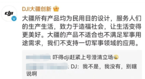 这话可不能乱说啊,俄罗斯驻华大使馆这微博一发,吓得大疆第二天就在评论区强调自己的立场:我们是民用的,并且不支持一切军事领域的应用。