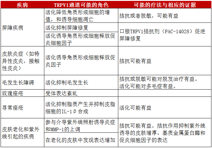 总的看下来,除了痤疮以外,其他疾病,基本上都是要压制TRPV1受体的活性,尤其是在屏障受损,或者光老化的情况下。