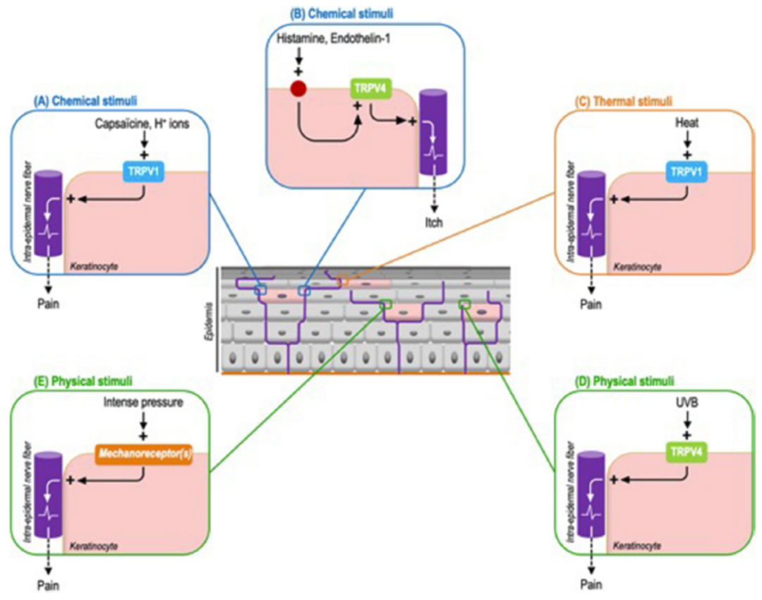 因此,护肤品上脸之后,产生的刺激,(多数)是痛觉。有一部分是痒觉,通路和机制跟痛觉很像,但不完全一样。今天不讲。