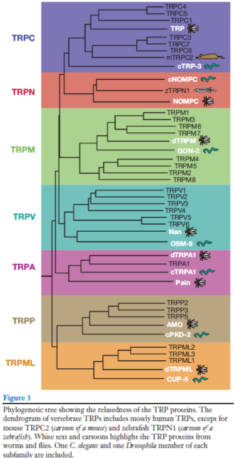 图:在不同种类的TRP通道名字后面,有一个小图标,代表的就是,这种通道在哪个物种上被发现。耗子是大鼠,小虫子是线虫,小鱼是斑马鱼,苍蝇是果蝇。Annu. Rev. Biochem. 2007