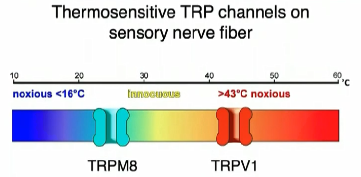 热的下限:43℃(TRPV1,辣椒素受体)