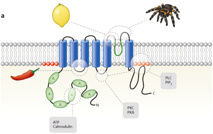 这上面用虚线椭圆形,标注出来的,就是TRPV1可以被影响的位点。