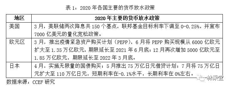 新冠疫情的暴发使得2020年全球经济增速下降3.4%,为了稳定经济和民生,美国、日本欧洲央行等主要经济体均采取了极度宽松的货币政策,不断扩大资产购买并推低利率,导致一些国家的基准利率接近零甚至负利率(表1)。