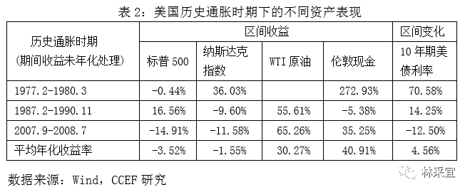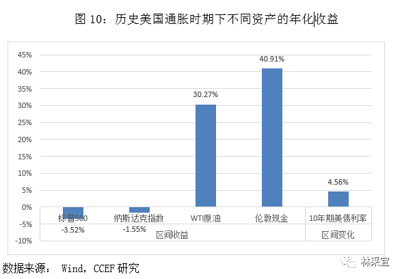 通过测算近3次历史美国通胀时期不同大类资产的表现,我们发现在通胀周期中黄金与原油的平均年化收益率最高,分别为40.91%和30.27%;其次是国债,10年期美国债收益率平均上涨4.56%;收益最差的是权益类资产(同期标普500指数和纳斯达克指数的收益率分别为-3.52%和-1.55%);相较于非通胀时期,商品类资产在历史通胀时期的收益更高。