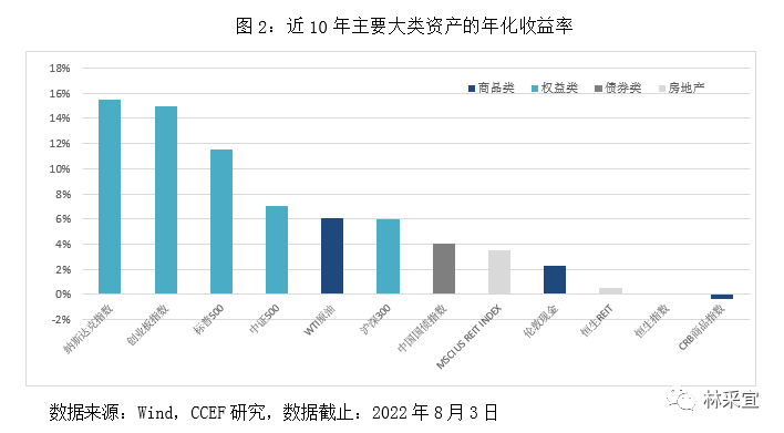 从10年期的投资回报来看,权益类资产的平均年化收益率最高,最近十年,纳斯达克指数和创业板指数的年化收益率分别为15.45%和14.96%,而恒生指数的年化收益率接近于零;中国国债指数收益率次于权益类资产和原油,但优于REITs、黄金和CRB商品指数。