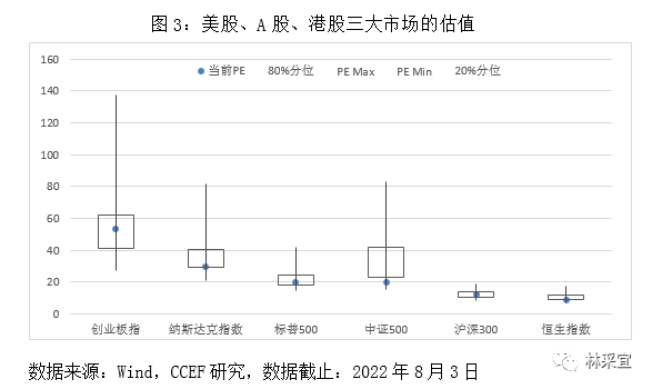 从美股、A股、港股三大市场主要指数的横向比较来看,当前A股的创业板指数和美国纳斯达克指数估值最高,分别为53.48和29.45;A股的沪深300和恒生指数估值最低,,分别为11.93和8.84。从历史价位来看,目前这些指数均的估值都处于50%分位数以下,创业板指数位于48.50%,而中证500、恒生指数分别位于8.60%和7.56%的低位。从估值的弹性来看,A股中的创业板、沪深500以及美股中的纳斯达克指数弹性最高,而估值处于较低水平的沪深300、恒生指数明显弹性不足。