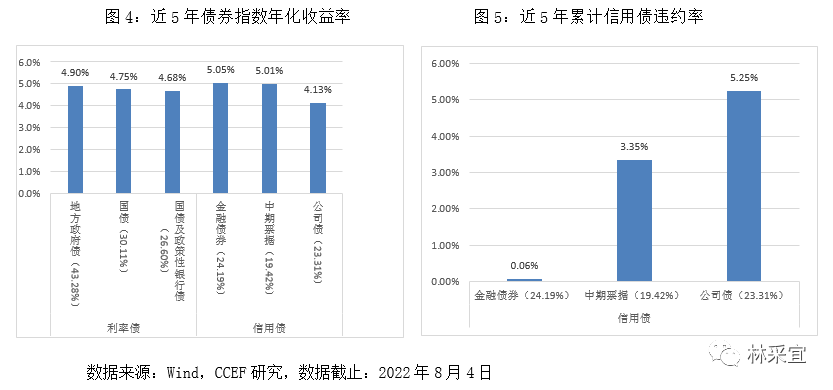 截至2022年8月4日,中国债券市场总存量138.52万亿,主要由利率债(占比57.54%)和信用债(占比32.09%)构成。近5年,大部分信用债指数的年化收益率略高于利率债指数,债券指数的年化收益基本高于4.5%,仅公司债(4.13%)的年化收益较低。总体上,债券指数的波动率在0.64%至1.89%的区间。