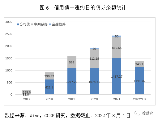根据近5年违约日的债券余额统计,公司债的累计违约金额远高于中期票据和金融债券。2022年以来,公司债和中期票据违约日的债券余额分别为1141.76亿元、243.1亿元(同期金融债券违约余额目前为0)。