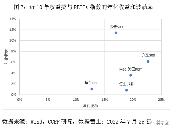 近10年,MCSI美国REIT和恒生REIT指数的年化收益率分别为3.54%和1.05%,年化波动率分别为19.58%和12.75%。其中,MSCI美国REIT指数不仅年化收益远低于标普500,同时波动率也相对更大。而恒生REIT相较于恒生指数,收益率更高且波动率更低。