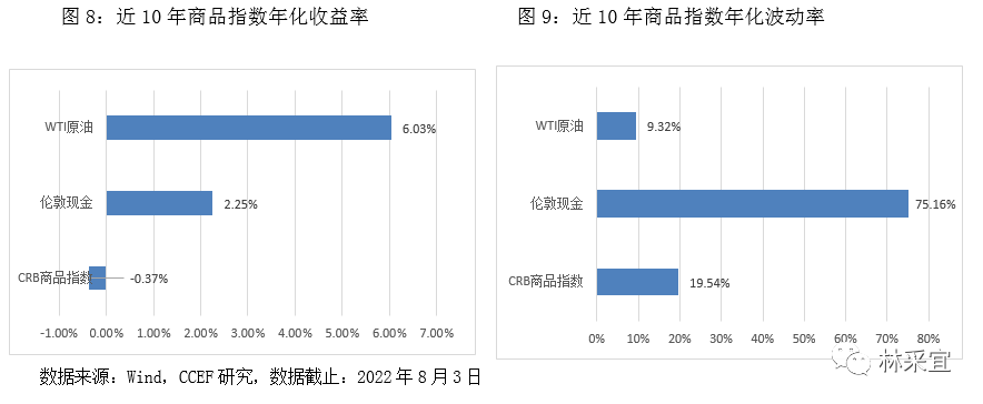 从10年长期投资商品的角度看,原油的年化收益率为6.03%,远高于黄金(2.25%)和CRB商品指数(-0.37)%。从标准差均值来看,伦敦现金的波动率最大,为75.16%;CRB商品指数和WTI原油的年化波动率分别为19.54%和9.32%。综合考虑收益和风险,CRB商品指数在负收益的同时相对波动较大。