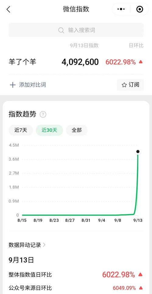 微信指数方面,自9月13日起,“羊了个羊”的微信指数爆炸级上升,日环比搜索量增长6022.98%。