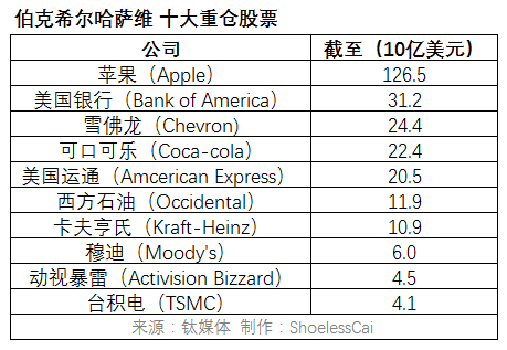 巴菲特旗下伯克希尔·哈撒韦公司前十大重仓股(来源:金融时报)