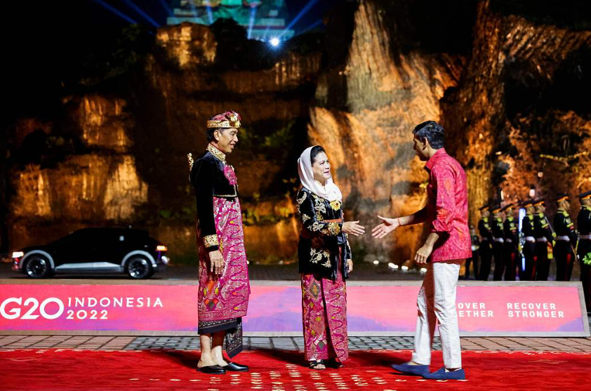 11月15日晚,二十国集团(G20)领导人峰会欢迎晚宴和文化表演在印尼巴厘岛举行。当晚,G20成员国、受邀参与国、国际组织的领导人大多穿着印尼传统服饰巴迪衬衫(Batik),主席国印尼总统佐科及其夫人伊莉亚则身着巴厘岛传统服饰。