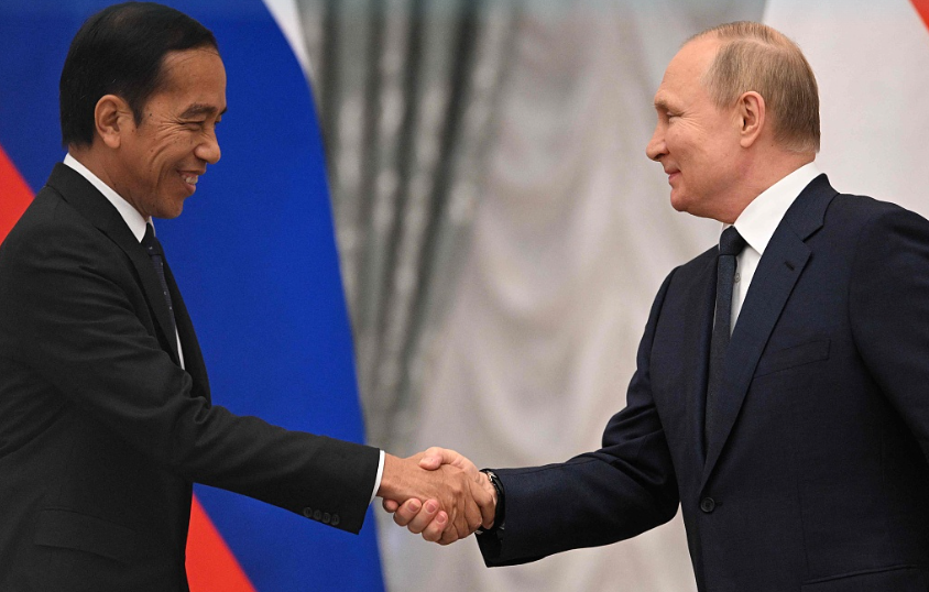 当地时间2022年6月30日,俄罗斯莫斯科,俄罗斯总统普京(右)在克里姆林宫出席新闻发布会后与印尼总统佐科握手。人民视觉 资料图