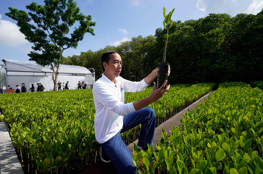 当地时间2022年11月16日,印尼巴厘岛登巴萨,G20峰会期间,印尼总统佐科·维多多在红树林植树。视觉中国 图