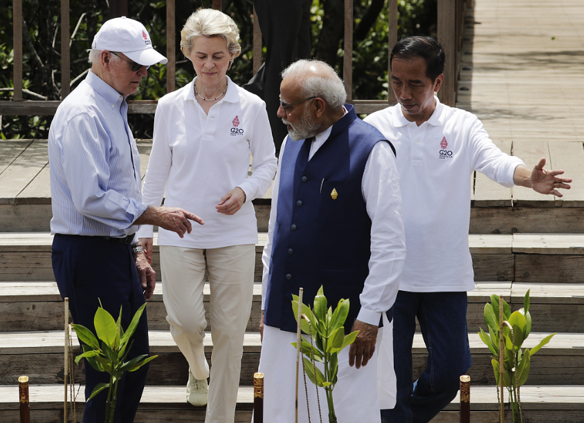当地时间2022年11月16日,印尼巴厘岛,G20峰会期间,美国总统拜登、欧盟委员会主席乌尔苏拉·冯德莱恩、印度总理莫迪和印尼总统佐科·维多多参加红树林种植活动。视觉中国 图