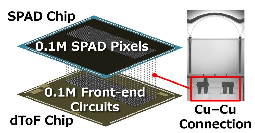 在用于激光雷达测距的诸多方法之中,SPAD像素用作dToF式传感器中的一种探测元素,它根据光源发射的光被物体反射后返回到传感器的飞行时间(时间差),来测量到物体的距离。索尼利用在CMOS图像传感器开发过程中创造的背照式像素结构、堆叠结构和Cu-Cu连接(铜元件连接)等技术,成功地构建了一种将SPAD像素和测距处理电路封装在单个芯片的独特元器件结构。这种设计令微小至10平方微米的像素尺寸得以实现,在小型化的同时在1/2.9型尺寸规格上达到约十万有效像素的高分辨率,还能增强光子探测效率和提升响应能力,以每15厘米作为一个单位范围从远距离到近距离进行高速度、高精度的距离测量。该产品符合汽车应用的功能安全标准,有助于提高激光雷达的可靠性,单芯片结构有助于实现更小型、低成本的激光雷达(SONY,2022)。