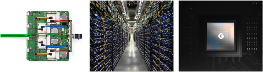 左:TPUv4 板;中:TPUv4 舱;右:Pixel 6 手机采用的谷歌张量芯片