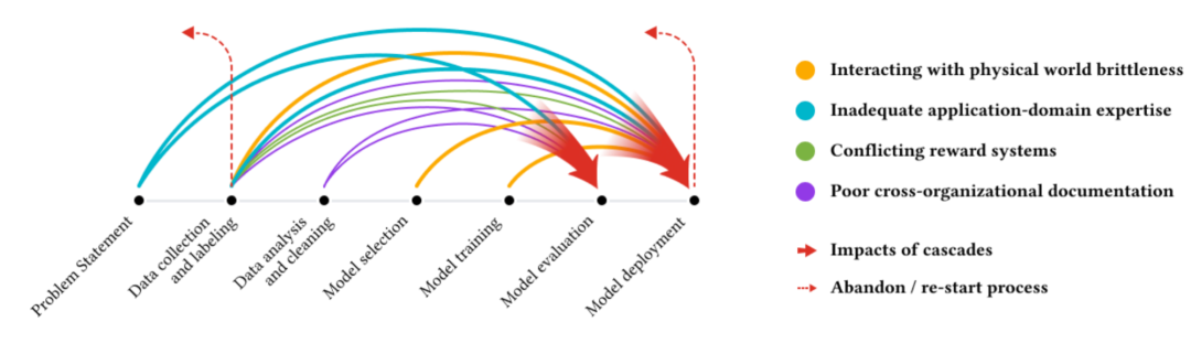 不同颜色的箭头表示各种类型的数据级联,每个级联通常起源于上游,在机器学习开发过程中复合,并在下游表现出来