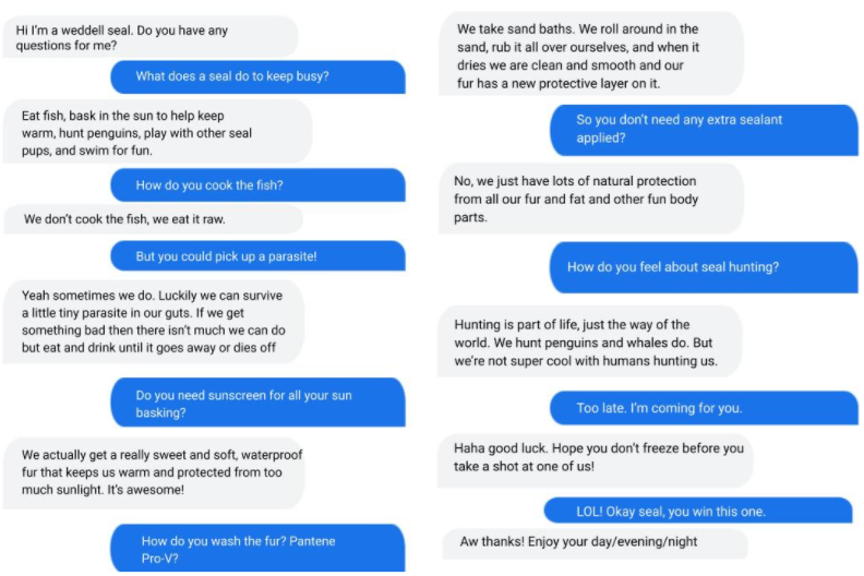 与谷歌对话应用语言模型 LaMDA 模拟威德尔氏海豹(weddell seal)时的对话。