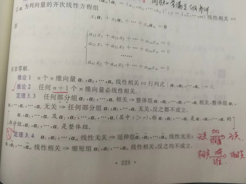 3.关于向量维度和线性相关、无关的关系,这里的维度指的是向量的分量。