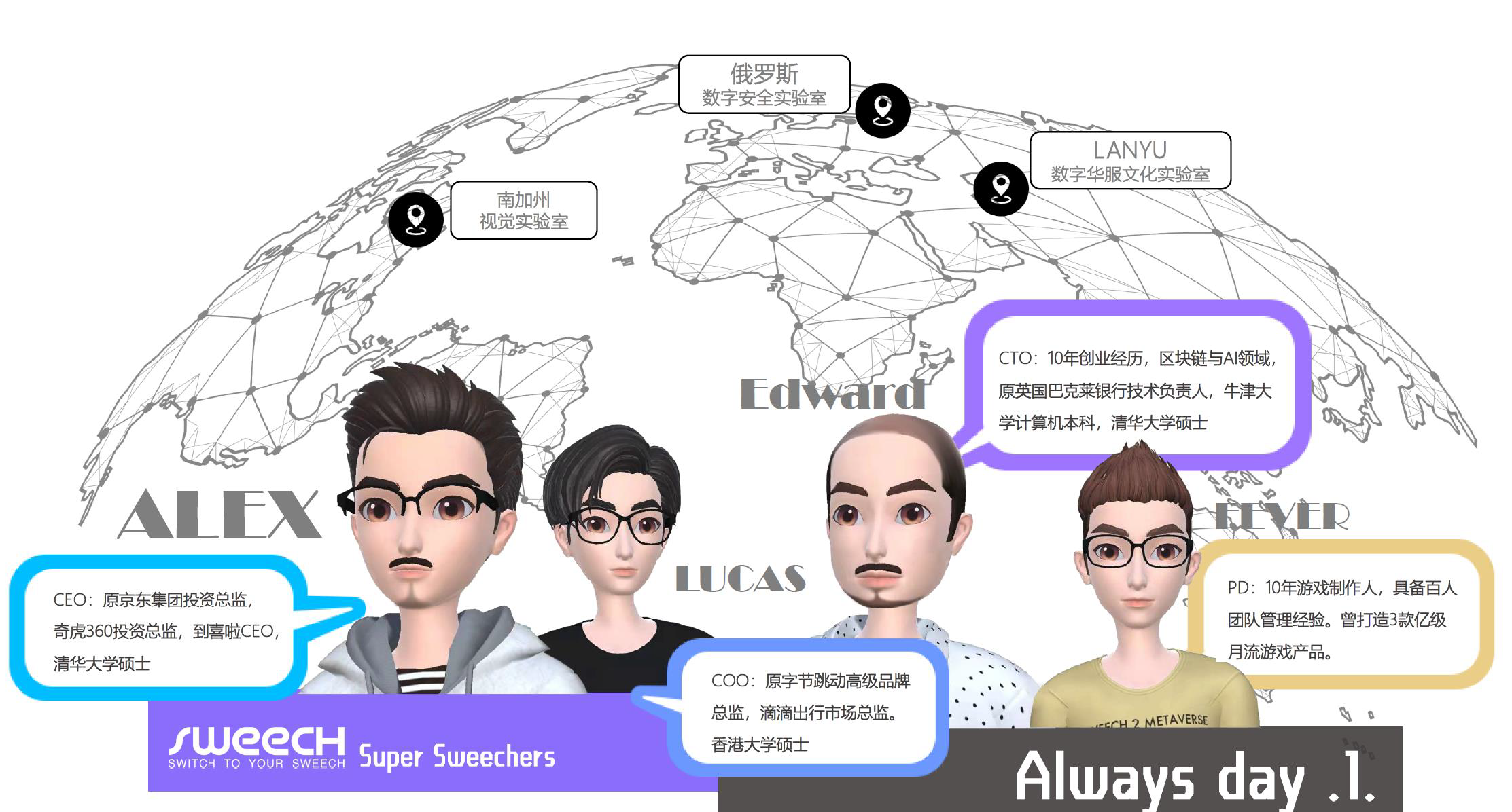 Sweech的创始团队都拥有着丰富的从业经验。CEO-王纪章曾任职京东集团,360,清华大学硕士;CTO-Edward毕业于牛津大学(Oxford U)计算机系,多年创业经验,AI、区块链、游戏领域非常资深;COO-Lucas原英国巴克莱银行技术负责人,在AI、区块链领域拥有10年创业经历,曾任职字节跳动,滴滴,香港大学硕士;PD-Fever有10年游戏制作人经验,曾打造3款亿级月流游戏产品。