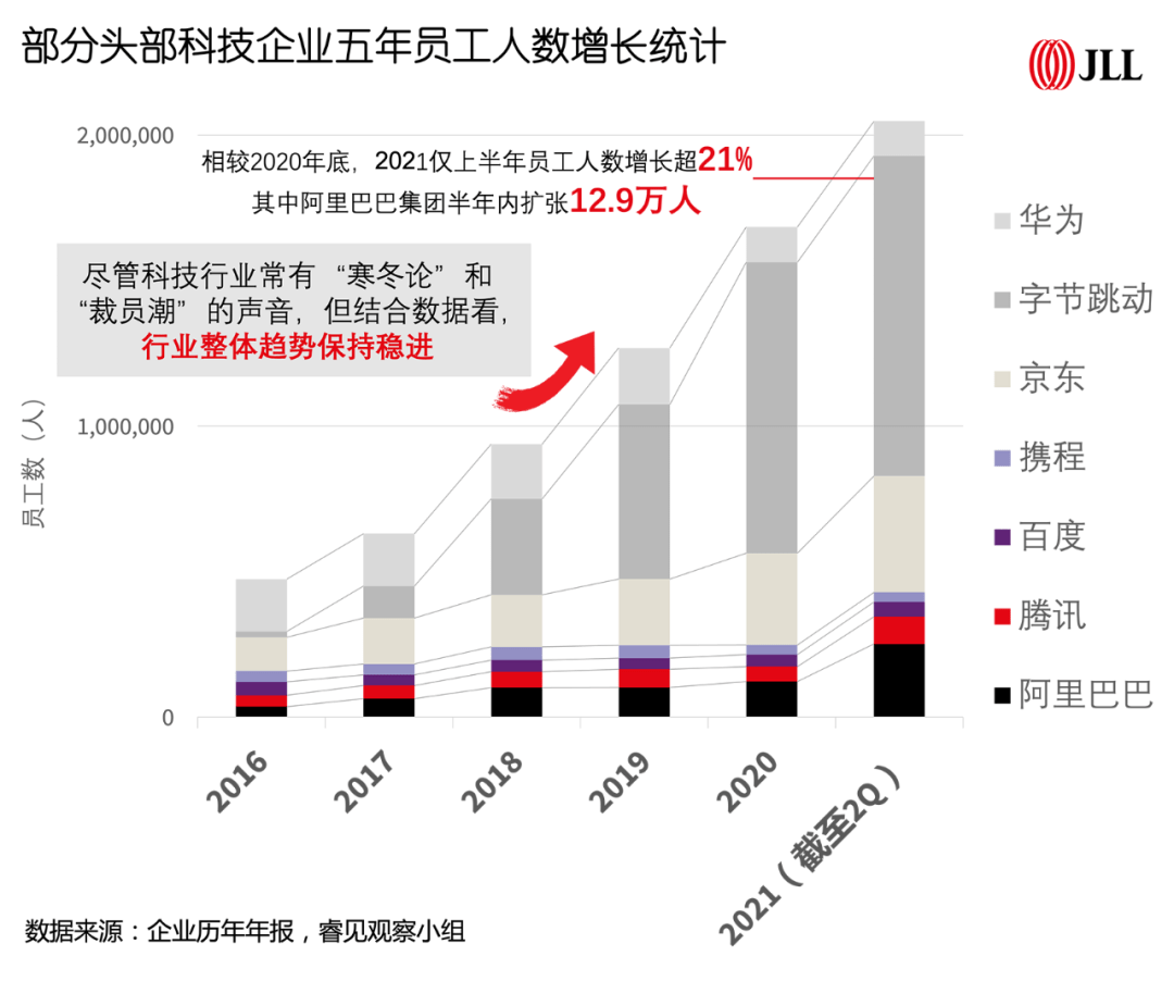 来自仲量联行的数据显示,国内10家头部科技企业在2021年上半年新增员工总数达到近40万人,较2020年底增长22%,大约相当于400万平方米的办公空间。