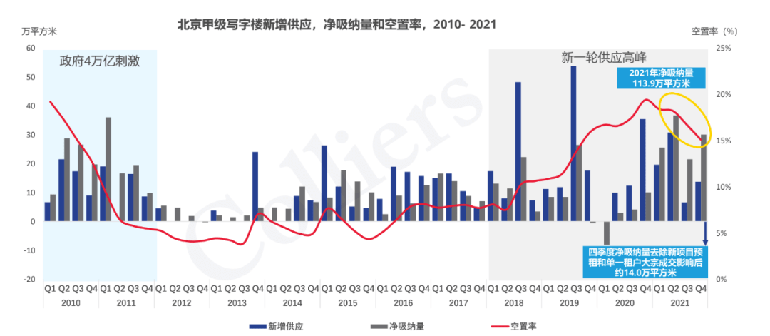 高力国际提供的数据可见,2021年全年来北京写字楼市场净吸纳量近114万平方米,这是有历史记录以来最好的去化表现。截至去年12月份,北京写字楼市场空置率已经降至15.1%,年降幅达到4.4个百分点。