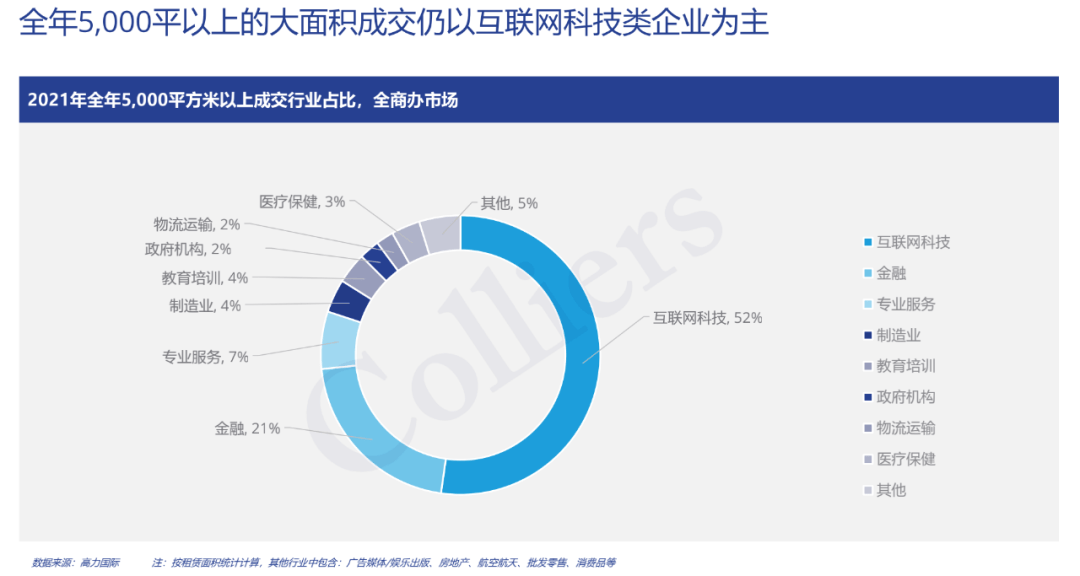 陆明表示,据不完全统计,在办公楼市场范围内,互联网科技企业在超过5000平米的大宗租赁成交中(仅包含新租和扩租)就已经接近140万平方米。大部分来自互联网头部大厂的扩张。如果再加上小于5000平米的租赁成交,保守估计该行业今年的新增办公面积至少在160-200万平米之间。