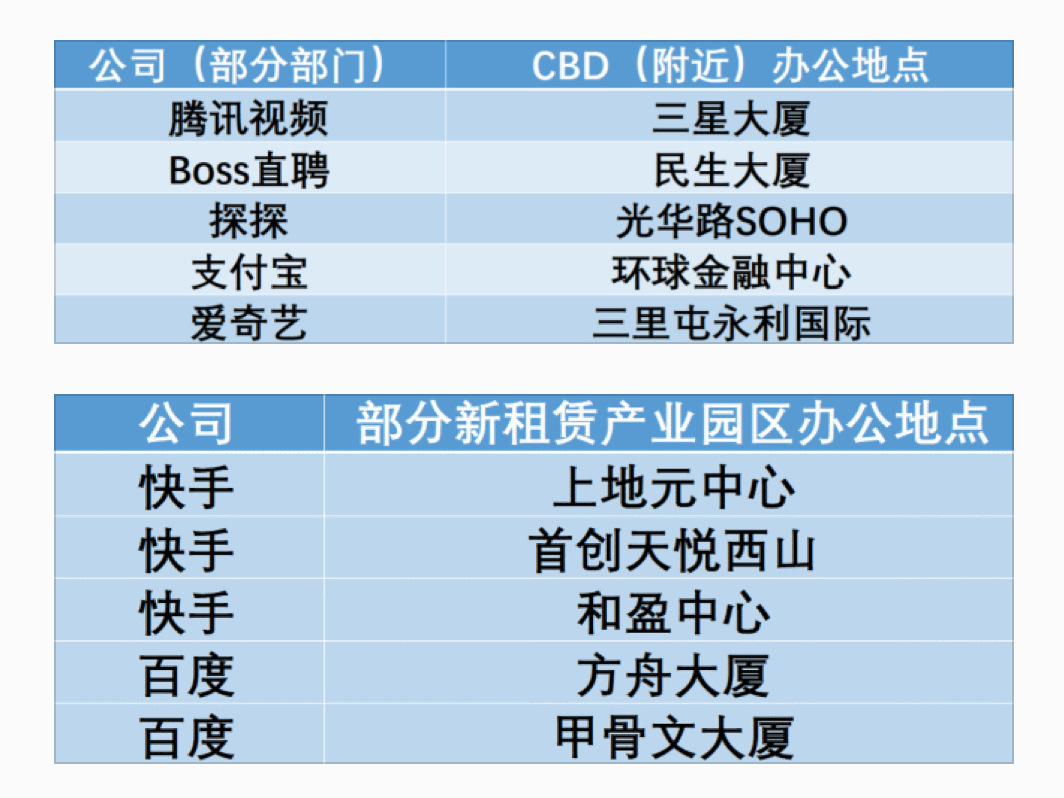 据36氪未来地产不完全统计,2021年快手分别租下首创天悦西山2.8万平米、万家灯火大厦8万平米、和盈中心1.8万平米、上地元中心9万平米;美团租用鼎城时代大厦8万平米,字节跳动租用时尚万科7万平米、国际创新融通中心8万平米,百度租赁方舟大厦1.9万平米。