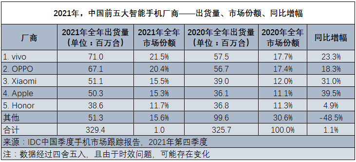 其中,出货量常年排名第二的vivo品牌,首次成为了中国智能手机市场的“新王”。这家公司2021年在中国一共卖出去了7100万台手机,占据了21.5%的市场份额,同比增幅达到23.3%。vivo之后,OPPO、小米、苹果和荣耀依次进入全国智能手机前五名中的后四位,市场占有率分别为20.4%、15.5%、15.3%和11.7%。